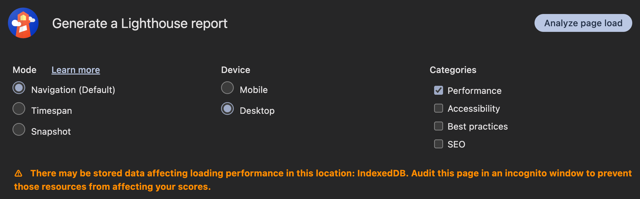 Select the following from the Lighthouse panel: