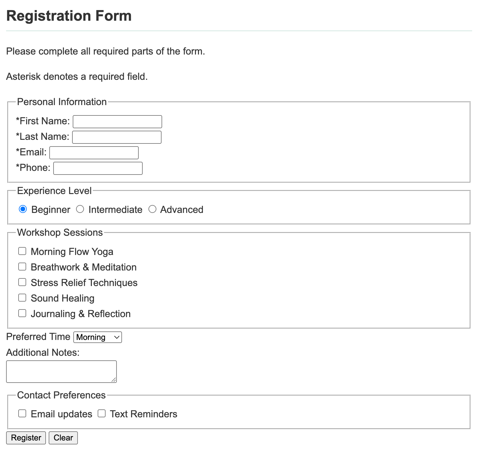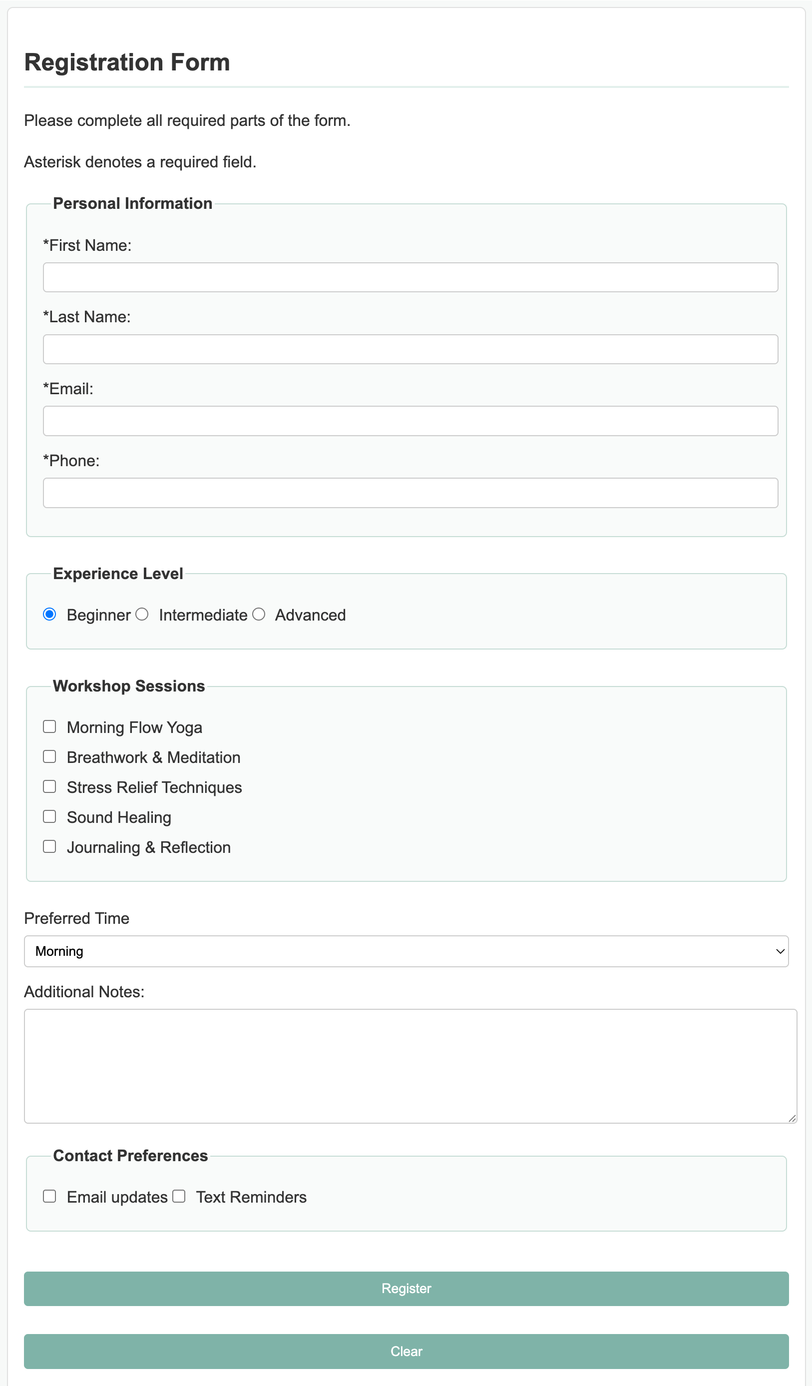 <fieldset>with the<legend>: Workshop SessionsField Type Label Checkbox Morning Flow Yoga Checkbox Breathwork & Meditation Checkbox Stress Relief Techniques Checkbox Sound Healing Checkbox Journaling & Reflection -